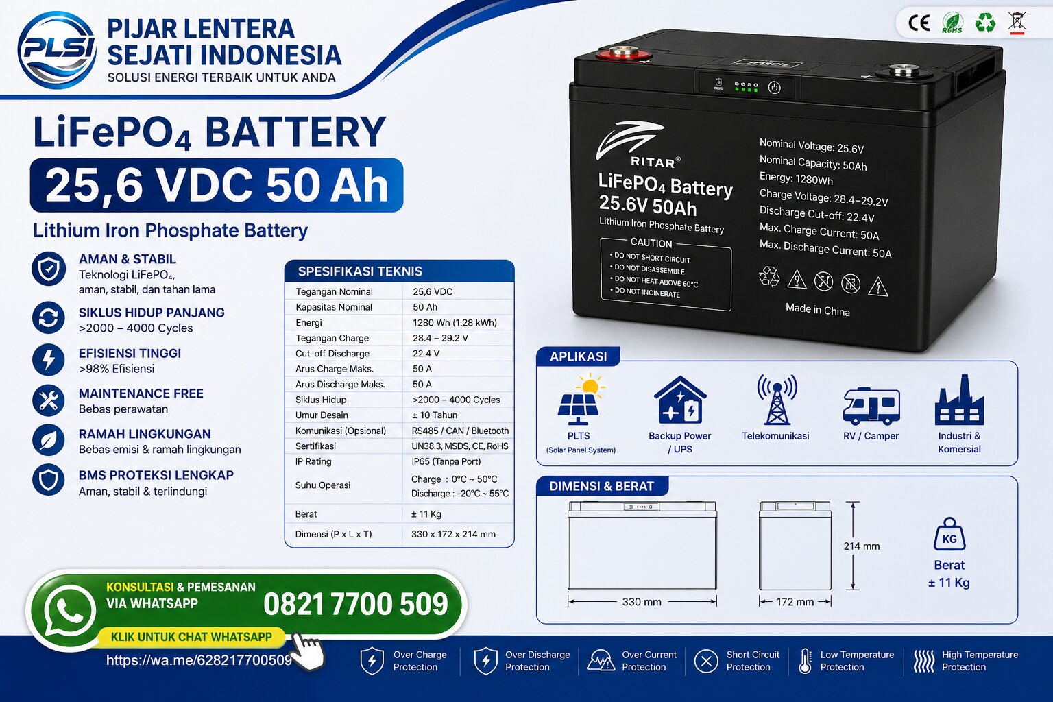 Berikut adalah pembahasan detail spesifikasi baterai LiFePO4 25.6V 50Ah Ritar serta bagaimana teknologi ini menjadi solusi nyata untuk berbagai masalah PJU di Surabaya.