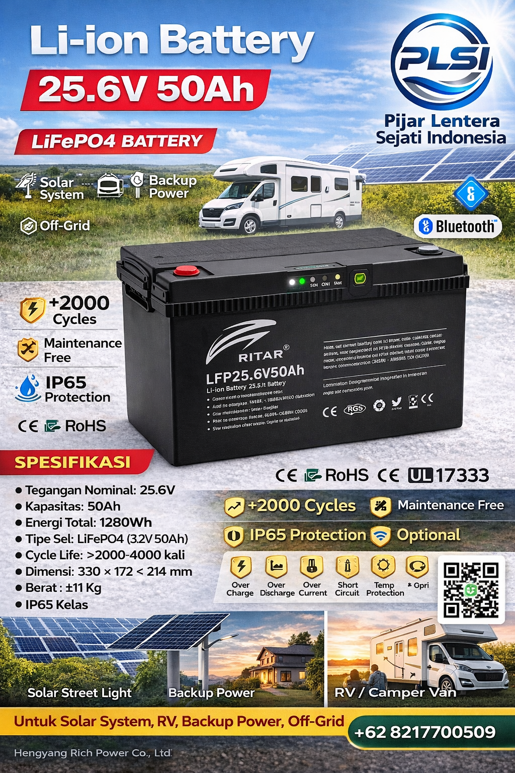 Baterai lithium seperti RV Battery 25.6V 50Ah hadir sebagai solusi dari masalah tersebut. Dengan teknologi Battery Management System (BMS), baterai ini memiliki perlindungan terhadap: