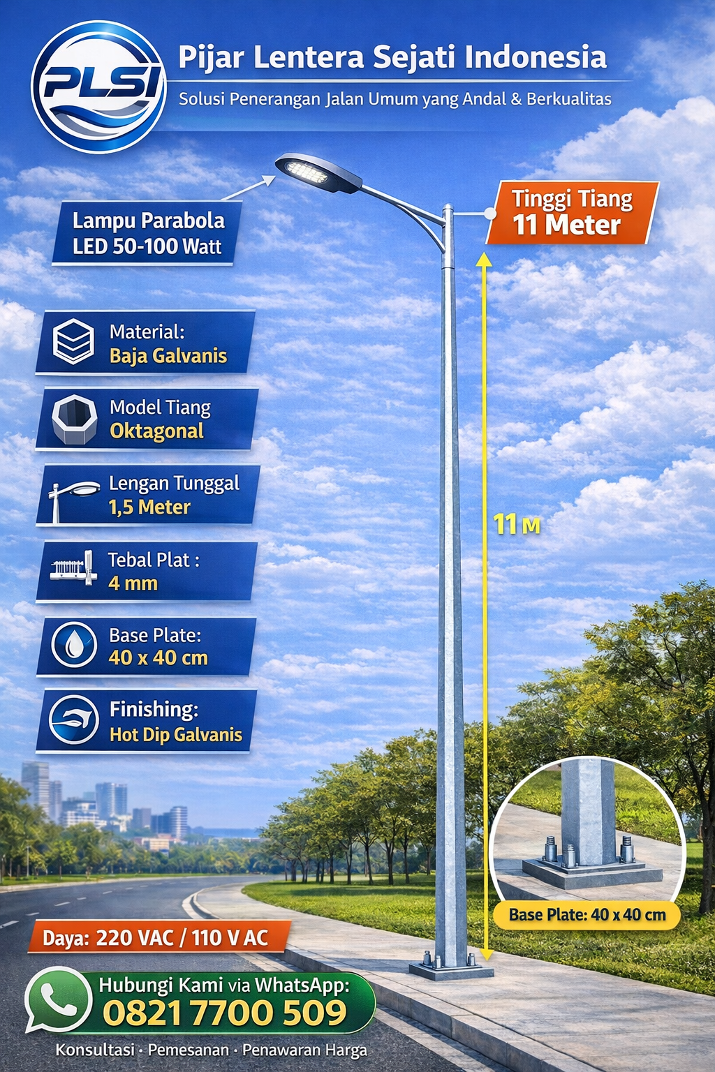 Sesuaikan tinggi tiang dengan lebar jalan. Untuk jalan utama atau kawasan industri, tinggi 11 meter sangat direkomendasikan.