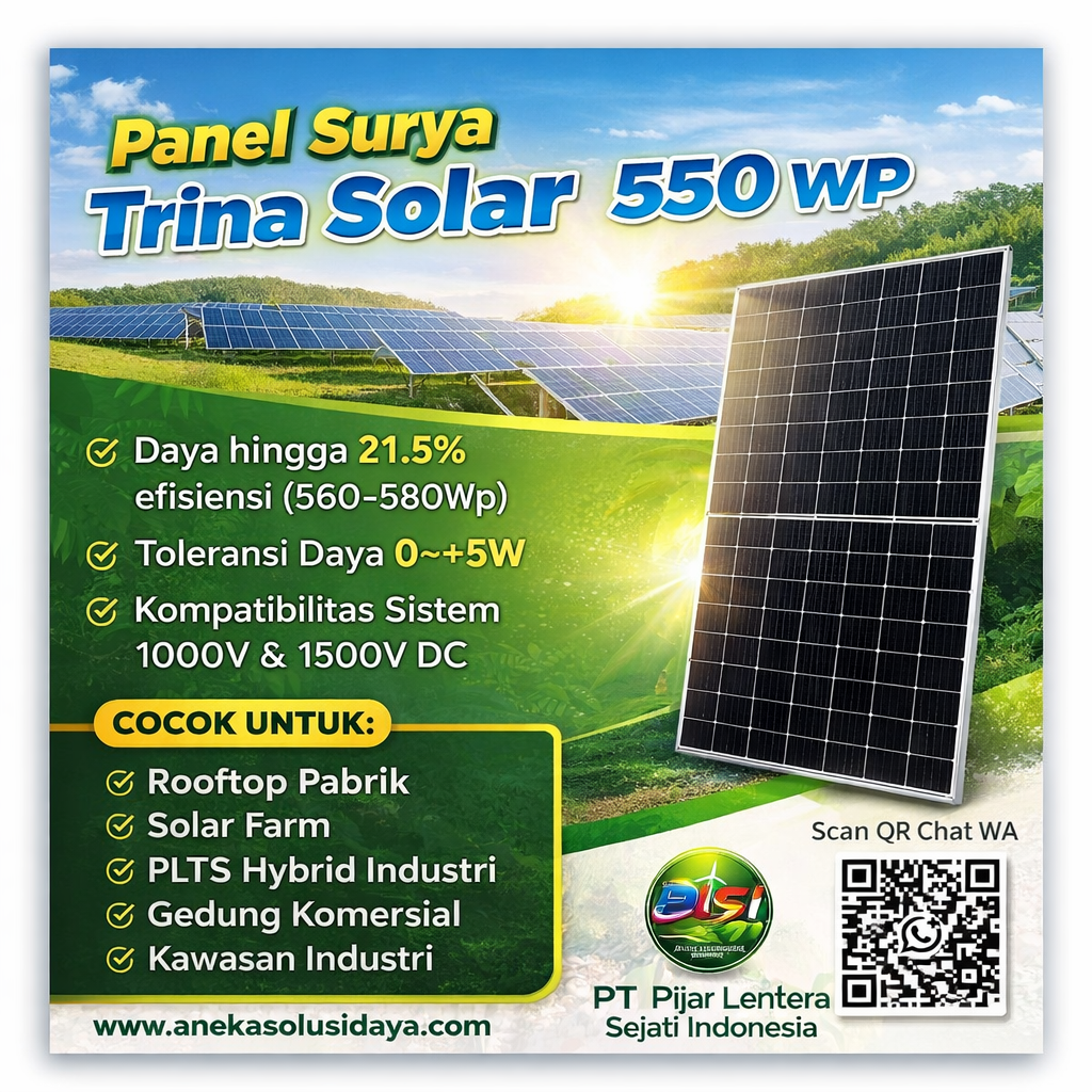 Dengan kombinasi efisiensi tinggi, LCOE rendah, kompatibilitas 1500V DC, kurva I-V stabil, serta kredibilitas global, Panel Surya Trina Solar 550 WP menjadi salah satu solusi unggulan untuk proyek rooftop industri, kawasan komersial, hingga solar farm skala utility yang menuntut performa teknis dan finansial optimal dari kelas Trina 575 Wp.