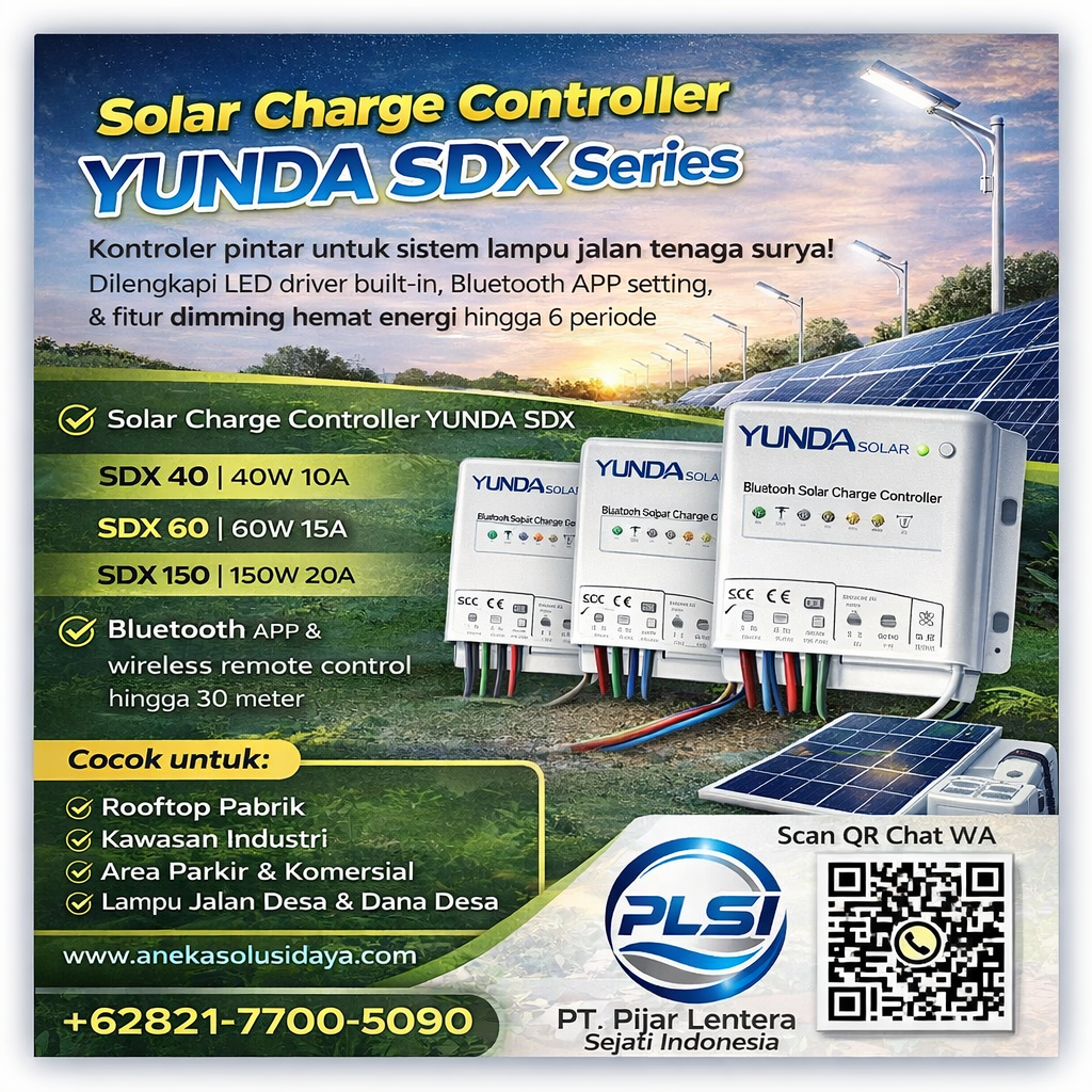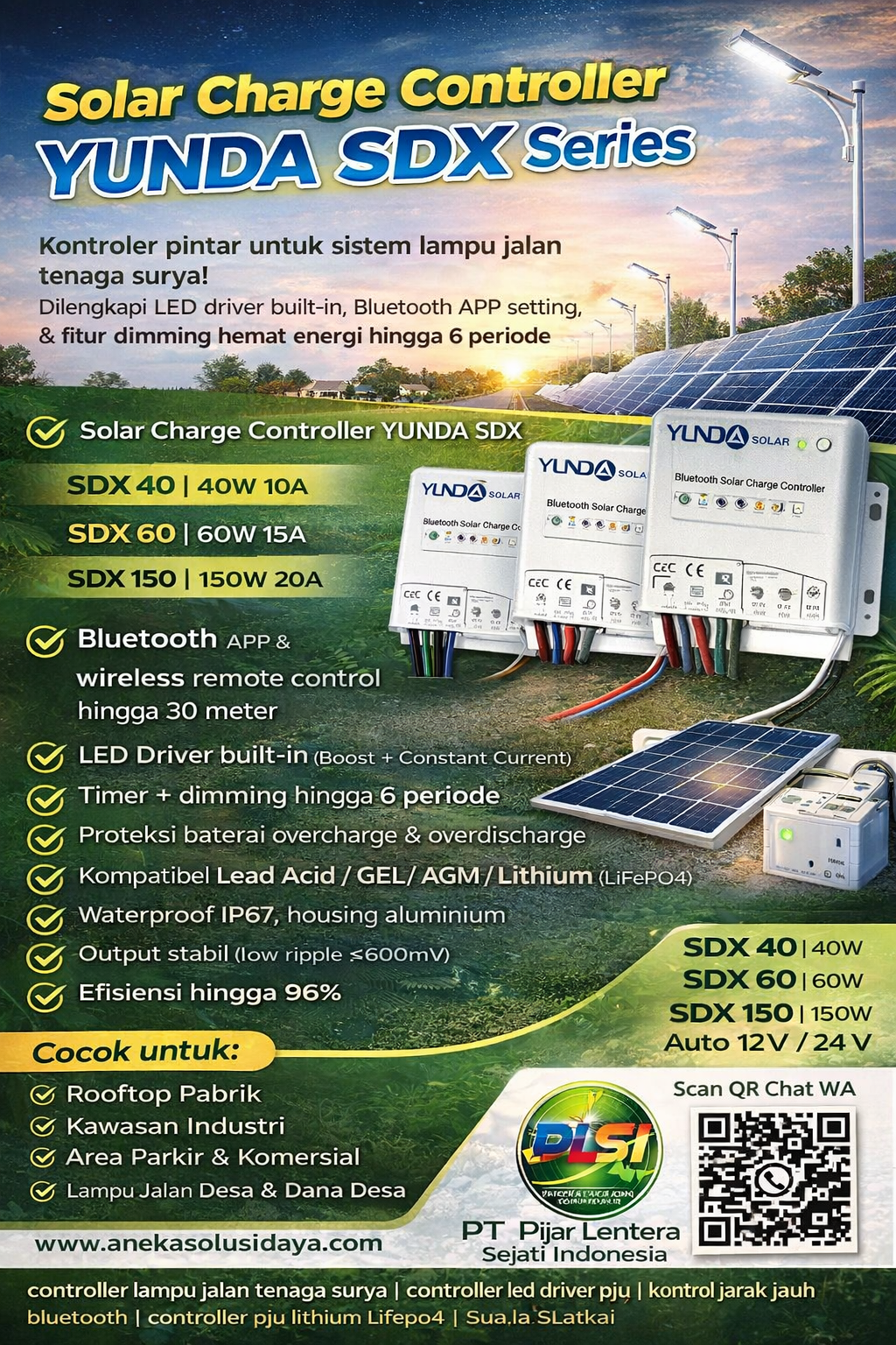 Solar Charge Controller YUNDA SDX menjadi salah satu solusi kontroler paling relevan untuk sistem lampu jalan tenaga surya modern. Di tengah meningkatnya kebutuhan proyek PJU tenaga surya, lampu taman surya, hingga solar street light skala desa dan industri, pemilihan controller yang tepat menjadi faktor penentu umur sistem, efisiensi energi, dan stabilitas pencahayaan malam hari. Banyak pencarian seperti controller lampu jalan tenaga surya bluetooth, solar charge controller PWM dengan LED driver, dan YUNDA SDX 40 60 150 spesifikasi menunjukkan bahwa pasar mulai mencari solusi yang lebih cerdas dibandingkan controller konvensional.