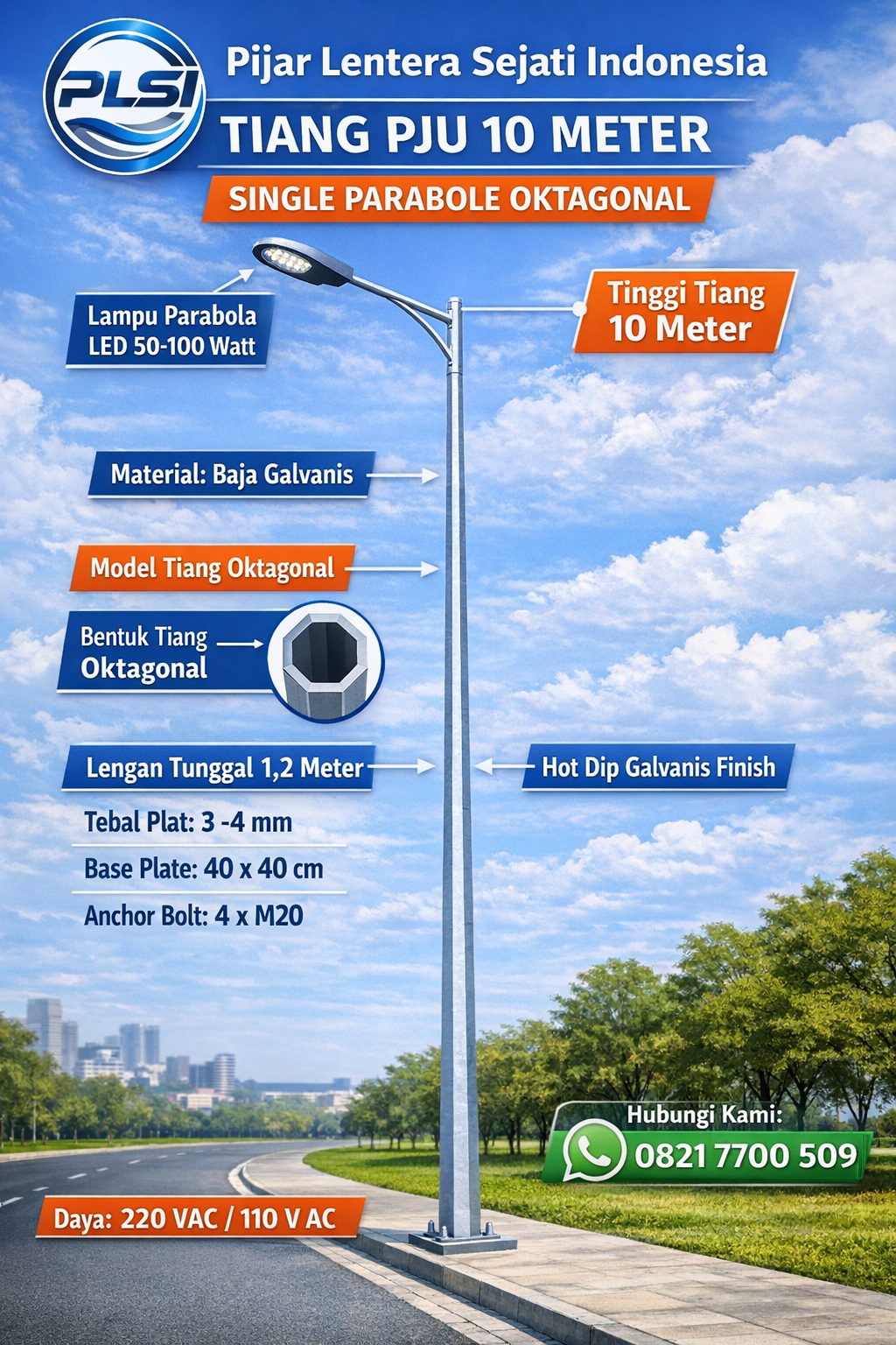 Spesifikasi Lampu PJU Octagonal 10 m Single Parabole bukan sekadar pilihan, tetapi investasi terbaik untuk proyek penerangan jalan yang profesional dan berstandar tinggi.
